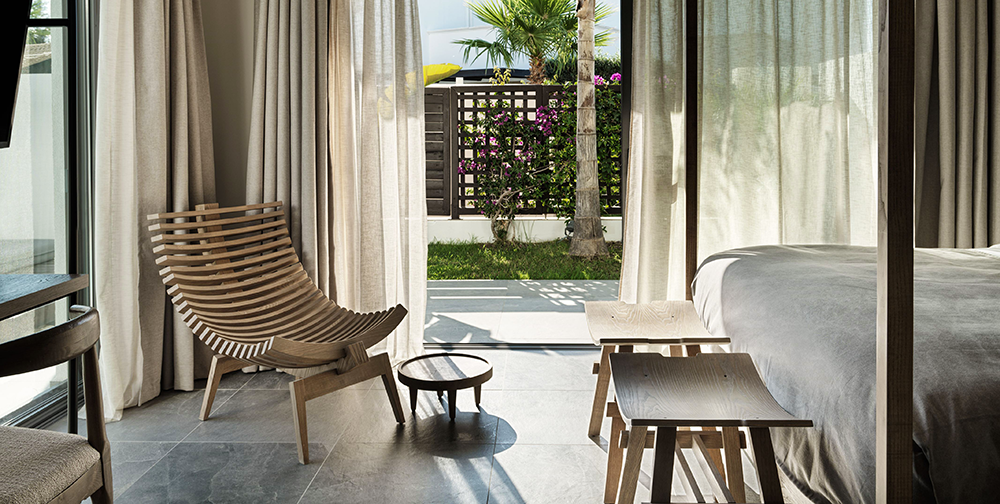 The 188 spacious rooms and suites have an inviting minimal ‘boho’ design, exuding refined elegance. Earthy tones and natural textures create a harmonious fl ow between the stunning surrounding nature with views of the Aegean Sea, and the relaxed indoor atmosphere.